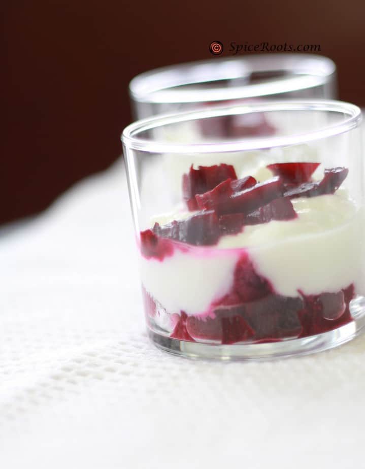 The parfait style yogurt based beet dish was a wonderful addition as a side dish. We grilled some chicken using tandoori spices, and served this as a side dish. Instant hit!