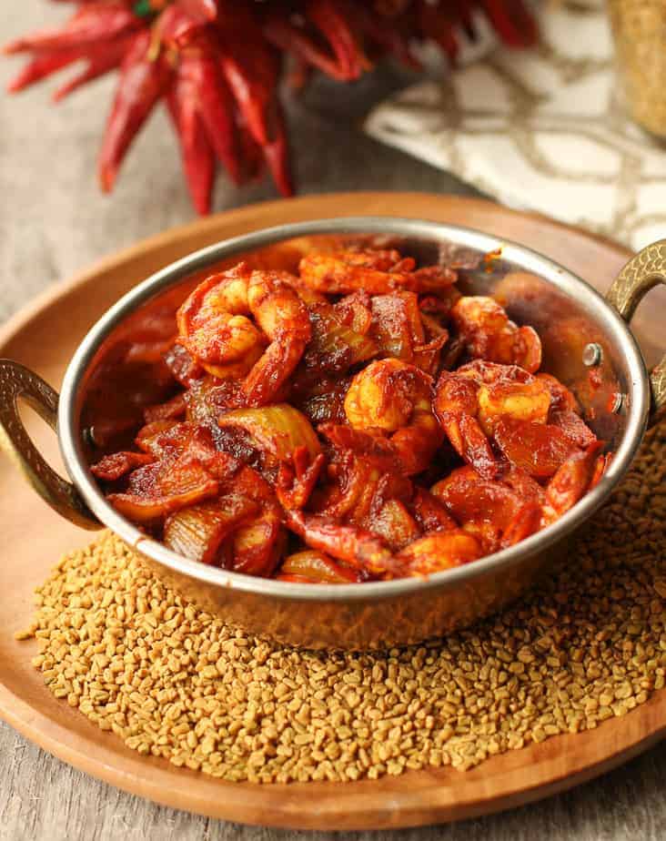 - Heat the oil and allow it to come to a smoky point. Turn down heat and the slightly crushed fenugreek seeds. Stir and add the onions.