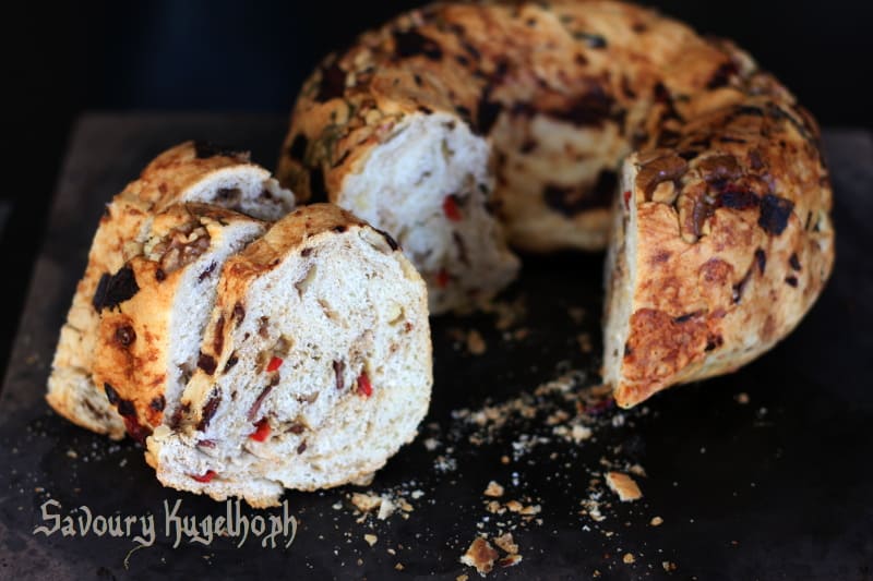 I have to admit, baking has taken a back stage at my home right now. It is after all Summer and we spend more time out than in. Grilling food and eating on the patio or packing a picnic is what we enjoy doing. So this Savory ( Savoury for the rest of the English world ) Kugelhopf came at the right time. I hadn’t baked in a while so it was a good project to work on. And since summer is also a time when I do tend to rise earlier than usual, making this bread early in the morning to bring it to hubby’s work buddies to enjoy with coffee was a bonus.